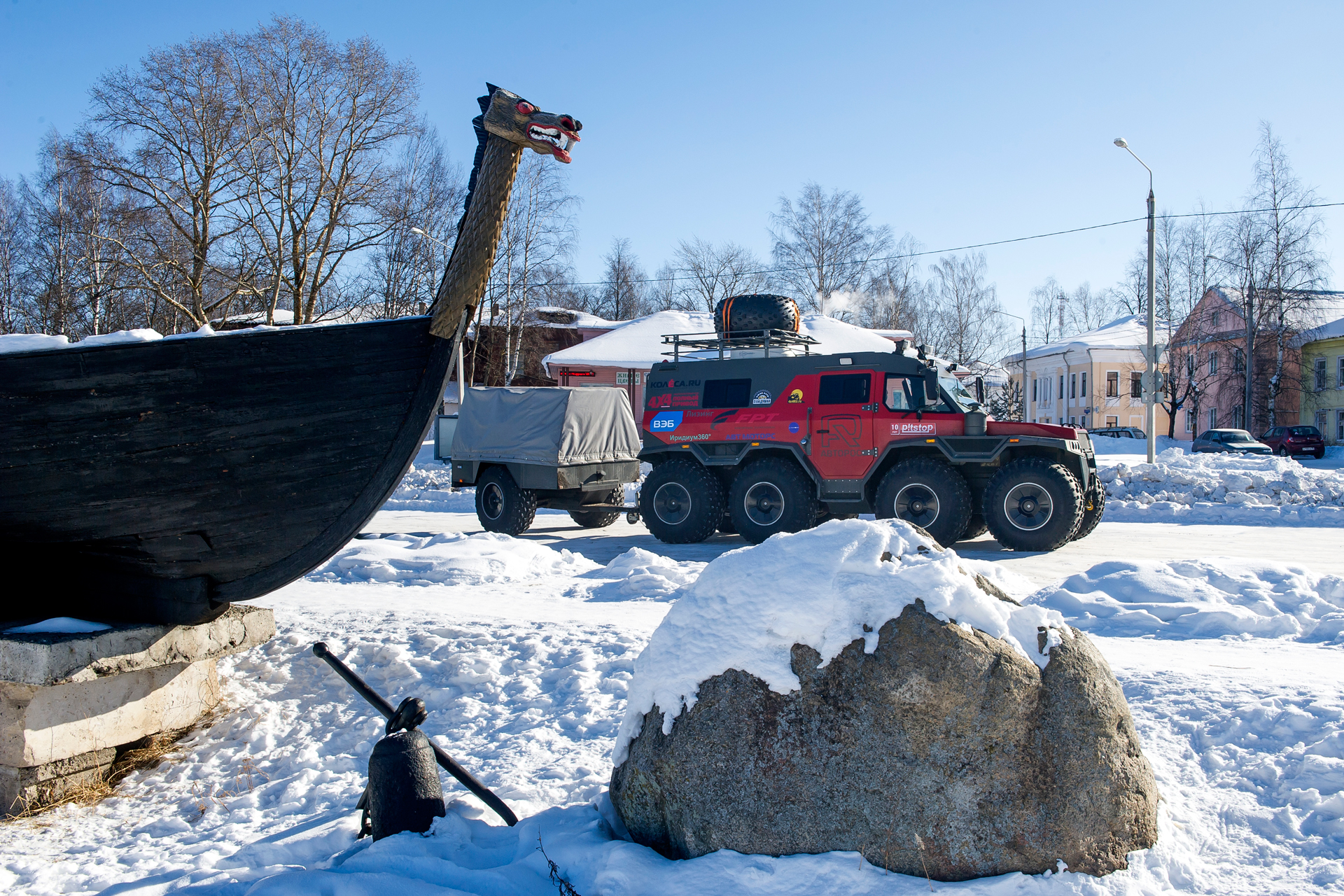 Первую сотню километров ехали в сильную метель, по асфальту металась поземка, лобовое стекло залепляло снегом, дворники обмерзали, однако после Бежецка погода наладилась. В Вологодской области дороги оказались во льду, но вездеходы шли по ним довольно уверенно, сказывались вес машин, количество колес. Возглавляет колонну "головастик" Павлова, за ним следует экипаж механиков, замыкает небольшую колонну экипаж журналистов. Едем дружно, хотя и не быстро: крейсерская скорость 55-60 км/ч. Впереди еще более 1000 верст - поход еще только в самом начале.